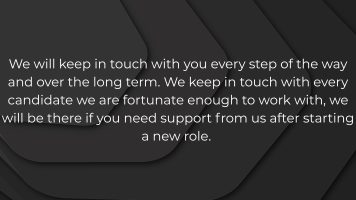 We will take the time to understand your needs and preferences, offer professional advice where possible and communicate with you regularly to keep you in the picture. We offer support in many areas, whether this be CV writing, interview preparation or anything else within the process, and will work hard to ensure you come away with the best result for you.